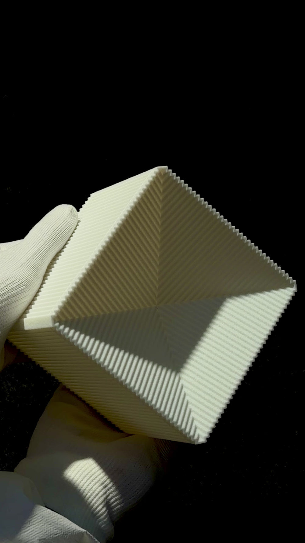 The vertical orientation of the corrugation establishes a sense of scale and direction, subtly elongating the form while breaking down its surface into smaller units. This approach recalls architectural cladding systems where repetition is used to manage proportion and introduce human scale without introducing overt detail.